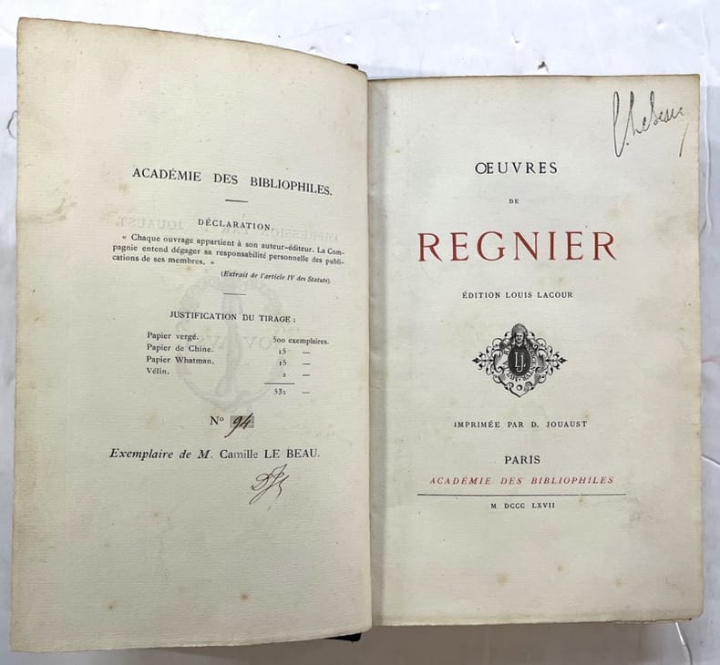 Paris, Académie des Bibliophiles 1867 In-8 22,5 x 13,5 cm. Reliure demi-chagrin havane, dos à nerfs, XVIII-309 pp., bandeaeux, lettrines, culs-de-lampe, table des poésies, index et glossaire, notes et variantes, table genérale des matières, liste des souscripteurs. édition tirée à 532 exemplaires. Celui-ci, N 94/500 sur papier vergé de M. Camille Le Beau.