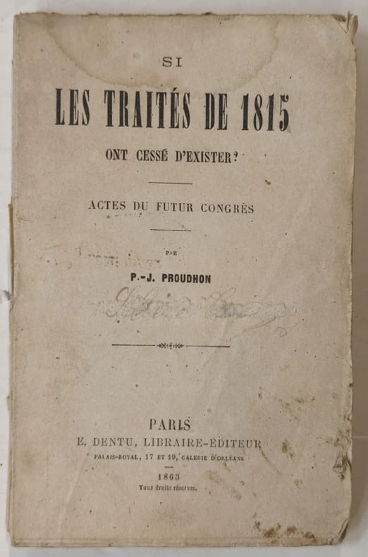 Édition originale. C'est l'un des textes les moins connus de Proudhon, et aussi un des derniers publiés de son vivant (il devait mourir en janvier 1865). À rebours des autres socialistes de son temps, il se montre l'adversaire des mouvements nationalistes et unitaires à l'oeuvre en Europe, comme le Risorgimento. - - VENTE PAR CORRESPONDANCE UNIQUEMENT - LIEN DE PAIEMENT, NOUS CONSULTER.