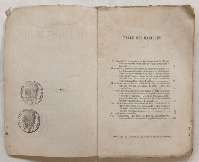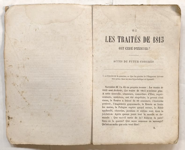 Deuxième édition. Paris, E. Dentu 1863. 108 pages.Table des Matières. Gravité de la question... Théorie générale des traités de paix... Rapport entre le droit public des États et le droit international... Des modifications faites aux traités de 1815...Continuation du même sujet... Question polonaise... Conclusion...Reliure demi chagrin marron de l'époque. Dos à nerfs orné de fleurons dorés. Quelques rousseurs. Dos frotté. Timbre Impérial. Bon état. Format in-12°(18x12).