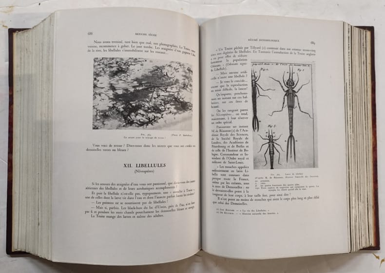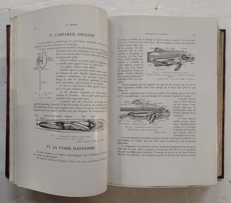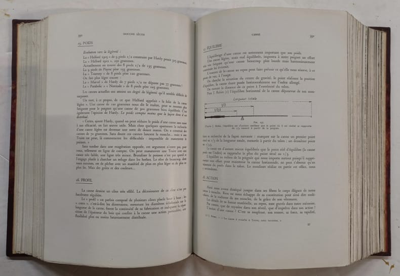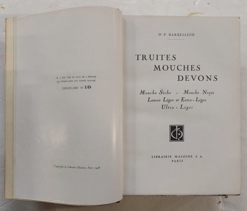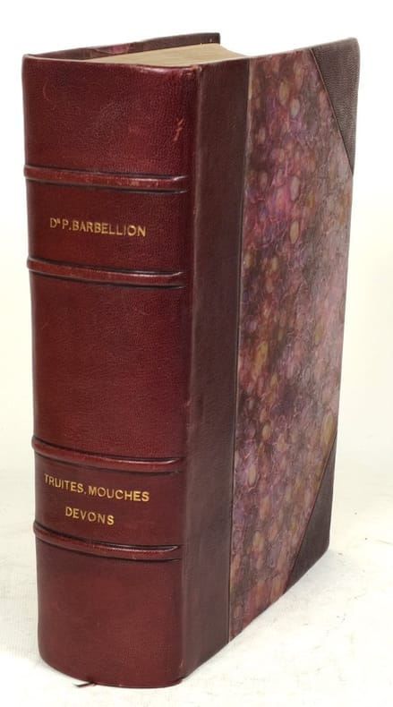 Librairie Maloine, Paris, 1948 1 fort volume grand in-8 (28 x 20,5 cm) de 1.181-(1) pages. Très nombreuses illustrations dans le texte et hors-texte en noir et blanc, figures techniques, schémas, reproductions de photographies. Reliure pleine toile verte éditeur, premier plat de couverture avec étiquette imprimée 14 x 12 cm contrecollée (truite avec titre doré), le tout en excellent état de conservation. Intérieur comme neuf. Beau papier satiné de qualité. Quelques infimes plis marqués aux coiffes. Édition originale. Il a été tiré en outre 350 exemplaires sur papier couché. Véritable bible du pêcheur de la truite à la mouche et au lancer léger, ce monumental ouvrage est l'oeuvre d'un pur passionné. Tout y est méticuleusement et précisément présenté : matériel, techniques, sensations, même l'écologie est largement présente dans ce superbe volume très recherché des collectionneurs-pêcheurs. C'est avec La Truite d'A. Vavon (1926), l'autre livre indispensable et incontournable qui doit être présent dans toute bibliothèque halieutique. Ouvrage riche de 52 illustrations hors-texte dont 34 planches photographiques en noir et 2 planches couleurs présentant des mouches artificielles, avec de très nombreuses figures techniques. Ce volume, relié sur un exemplaire broché à l'état de neuf, possède son premier plat de couverture (le seul illustré) en parfait état, ce qui est notablement rarissime pour cet ouvrage. Il n'est pas rare de trouver cet ouvrage dans un état médiocre ou passable, dans un superbe état de fraîcheur tel qu'ici c'est une autre histoire ... Superbe exemplaire resté très frais dans sa reliure éditeur pleine toile décorée.