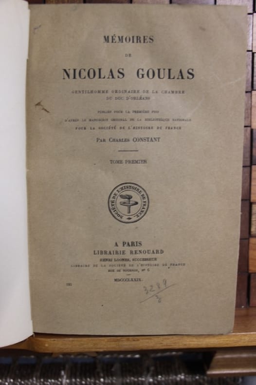 Publiés pour la première fois d’après le manuscrit original de la bibliothèque nationale pour la société de l’Histoire de France - Nicolas Goulas né 14 mai 1603 et décédé le 3 avril 1683, secrétaire des commandements de Gaston d'Orléans. Ses mémoires Ils couvrent la période 1627-1651 et la Fronde. Bon état d’occasion