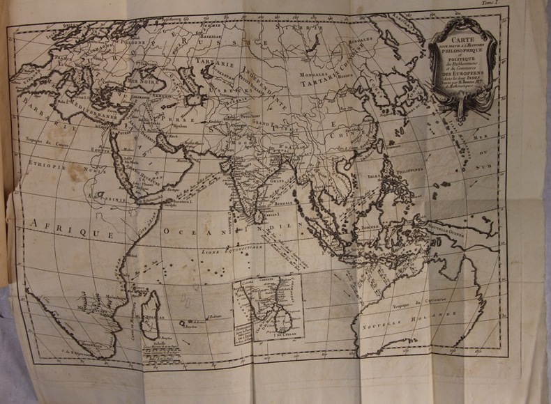 La grande édition du Raynal : elle est illustrée d'un portrait par Cochin, de 4 figures par Moreau gravées par De Launay, Delignon et Simonet et de 23 tableaux hors-texte. L'atlas comprend 50 cartes gravées dont une carte dépliante des deux hémisphères et 49 sur double page par M. Bonne, Ingénieur-hydrographe de la Marine Publié de manière clandestine dès 1770, puis condamné par le Parlement de Paris, l’ouvrage rencontra un succès considérable. Outre une histoire de l’exploration et de la colonisation de l’Amérique, il contient une vive dénonciation de l’esclavage et de l’exploitation des colonies. Chadenat, n°1960. — Sabin, n°68081.