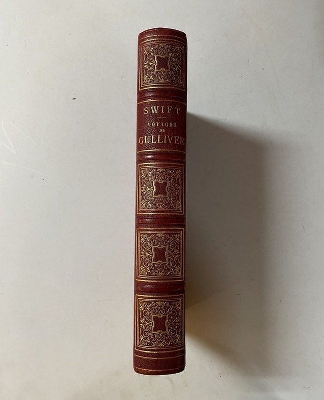 Voyages chez plusieurs nations reculées du monde par Lemuel Gulliver, d'abord chirurgien puis Capitaine sur différents vaisseaux. Nouvelle édition, avec de nombreuses illustrations, bandeaux, lettrines et culs de lampe dans le texte en noir et en couleurs de Poirson vol demi cuir à coins, 26x17, superbe exemplaire, tranche de tête dorée à l'or fin, 430pp . Couverture d'origine conservée, état neuf. Paris, Quantin, 1882/84