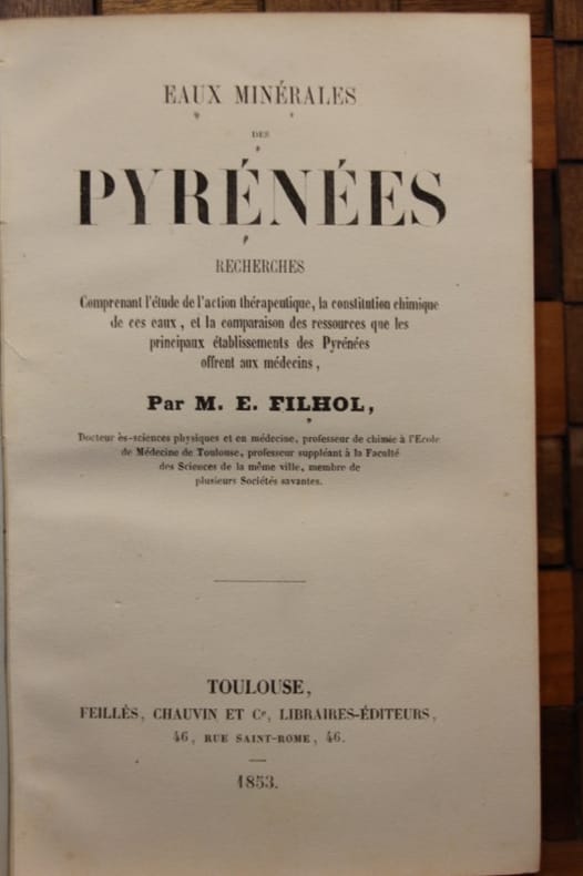 ÉDITION ORIGINALE. Elle est illustrée de 7 tableaux dépliants et de 3 planches dépliantes (plan général des thermes de Luchon, détails d'un appareil conservateur du principe sulfureux utilisé à Bagnères de Bigorre et appareil aspirateur employé pour analyser l'air des piscines, salles de douches, etc.). Édouard FILHOL (1814-1883) était chimiste et devint professeur à l'école de médecine de sa ville. Il pratiqua aussi la minéralogie, l'hydrologie, l'étude des cavernes et fut un des premiers défenseurs de "l'Homme fossile". Maire de Toulouse, il créa le Muséum d'histoire naturelle (1865) dont Noulet souhaitait la création depuis 1831. (Dendaletche, 734 - Labarère, 572). BON EXEMPLAIRE en reliure d'époque, complet des planches et tableaux dépliants. GOOD COPY. PICTURES AND MORE DETAILS ON REQUEST.