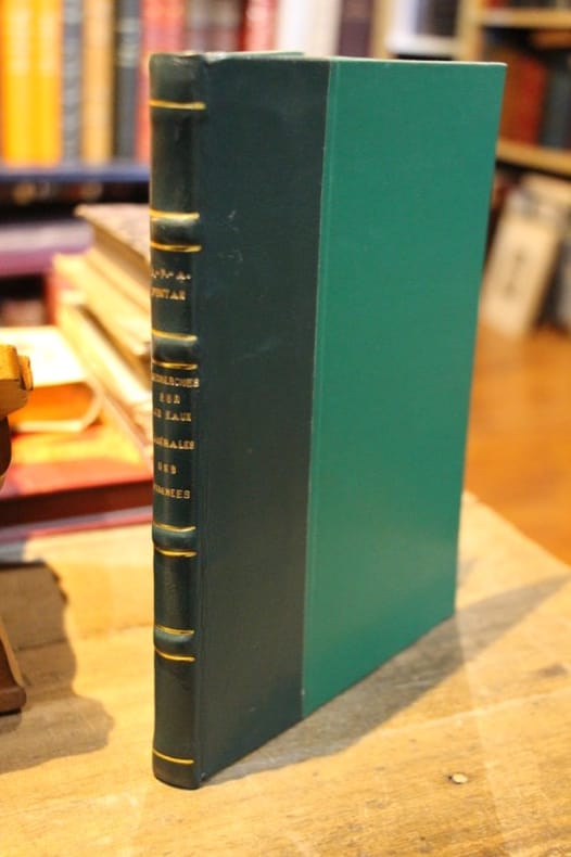 Paris, Masson [et] Toulouse, Feillès, Chauvin et Cie, 1853. In-12 (120 x 180 mm), XVI et 540 pages, reliure demi-veau d'époque, titre, auteur et filets dorés sur dos lisse, 7 tableaux dépliants, 3 planches dépliantes : Plan général des Thermes de Luchon - Détails d'un appareil conservateur du principe sulfureux pour la Buvette des Eaux de Labassère aux Bains de Théas à Bagnères de Bigorre - Appareil aspirateur de M. Boisgiraud qui a été employé pour analyser l'air des piscines, salles des douches, etc. .- Édouard FILHOL (1814-1883) était chimiste et devint professeur à l'école de médecine de sa ville. Il pratiqua aussi la minéralogie, l'hydrologie, l'étude des cavernes et fut un des premiers défenseurs de "l'Homme fossile". Maire de Toulouse, il créa le Muséum d'histoire naturelle (1865) dont Noulet souhaitait la création depuis 1831. (Dendaletche, 734 - Labarère, 572). Qqs lignes discrètement soulignées à l'encre sur une page. BON EXEMPLAIRE en reliure d'époque, complet des planches et tableaux dépliants. Petit ENVOI AUTOGRAPHE DE L'AUTEUR en page de garde (dédicace)