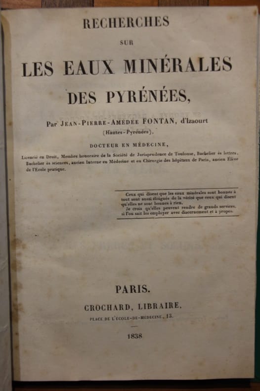 DEUXIEME EDITION, la première ayant parue en 1838 chez Crochard ; cette édition ne comportait que 136 pages. L'ouvrage est partagé en trois parties : 1°) "Recherches sur les eaux minérales des Pyrénées" - 2°) "Recherches sur les eaux minérales de l'Allemagne, de la Belgique, de la Suisse et de la Savoie" - 3°) "Mémoires sur les eaux thermales de Bagnères-de-Luchon". ENVOI AUTOGRAPHE signé de l'auteur : "à Mr. Le Dr. Constant Despieu / Témoignage d'estime et / d'affection de l'auteur / A. Fontan". (DENDALETCHE, 758). Quelques rousseurs, néanmoins exemplaire en BEL ETAT. NICE COPY. PICTURES AND MORE DETAILS ON REQUEST.