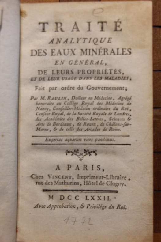 Edition originale. Raulin (1708-1784) fut inspecteur des eaux minérales. Liste alphabétique des principales eaux minérales en usage dans le royaume. Bon état d’occasion Livres anciens