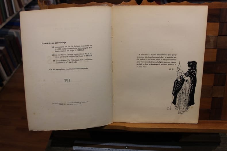Baconnier - Alger 1935 In-8 broché 27,5 cm. Bon état d’occasion. Illustrations de Roger J. Irrièra tirées en Héliogravure. Ex. N204 sur pur fil lafuma accompagné d’un croquis annoncé dans la description de l’éditeur