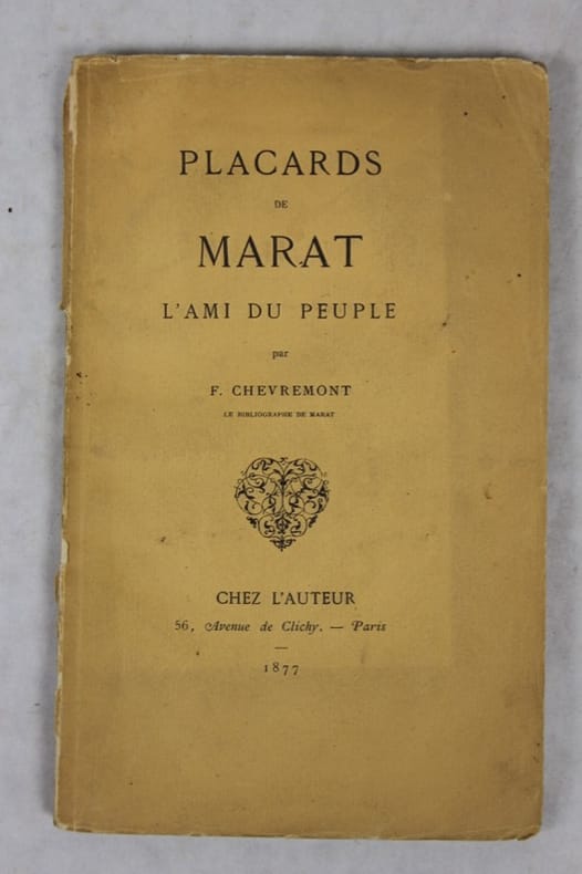 Réédition des sept rarissimes placards de Marat acquis par le biographe (ceux de Marat lui-même, conservés par sa soeur) au format du journal et qui manquaient à l’Index du bibliophile publié par l’auteur. Bon état d’occasion