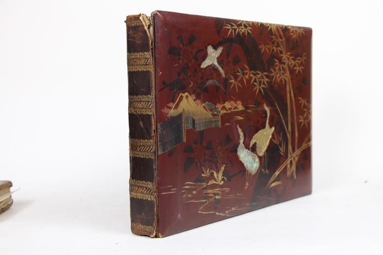 ca. 1880 Album in-8 oblong à l’orientale, plats de bois laqué, le premier illustré d’un jeu de raquette opposant deux femmes , un visage incrusté d’ivoire accroc du second. Premier plat délié.