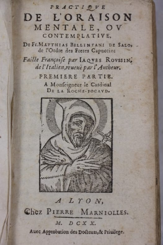 Edition en français par Jaques Roussin. Un des premiers livres d’introduction a la vie d’oraison, suivi de nombreuses méditations pour s’y exercer pratiquement, qui connut un succès rapide dans le contexte de la reforme post-tridentine (première édition française en 1593). Bon état d’occasion