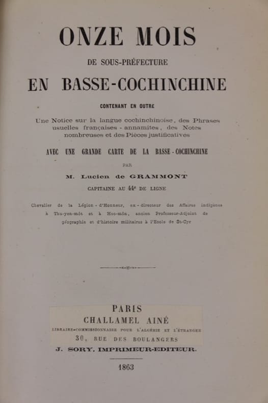 Très rare témoignage, quatre ans après la prise de Hanoï, de cet officier directeur des Affaires indigènes à Hoc-môn et Thu-Yen-Mot, ancien professeur de géographie et d’histoire militaire à Saint-Cyr. Une description très soigneuse couvrant l’hydrographie, le climat, les voies de communication, l’économie, l’ethnologie, l’occupation militaire et navale, les division administrative, enfin le récit de la conquête, l’insurrection annamite et le traité de Saîgon. Belle et très précieuse carte pour l’illustration du propos. Bon état d’occasion