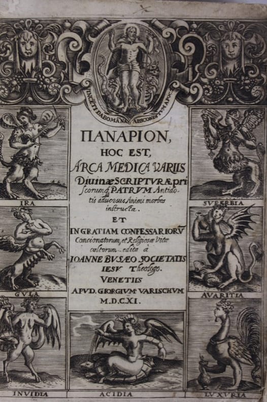 Rare encyclopédie des maladies mentales et les comportements immoraux avec leurs remèdes bibliques, par théologien jésuite allemand Johann BUSAEUS (1547-1611). La page de titre gravée dispose en vignettes les sept péchés capitaux, le Christ au sommet terrassant un monstre à sept têtes. Très bon état d’occasion