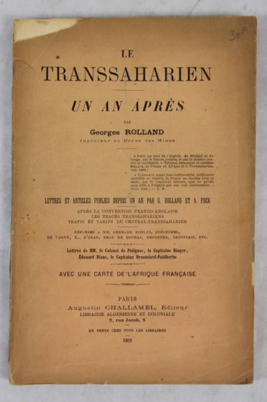 Lettres et articles publiés depuis un an par G. Rolland et A.F ock. Après la convention franco-anglaise. Les tracés transsahariens. Trafic et tarifs du central-transsaharien, etc. Très bon état d’occasion