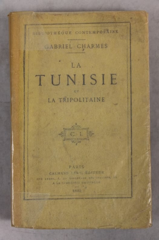 L'auteur, ayant quitté l'Egypte en pleine insurrection militaire, a parcouru la Tunisie et la Tripolitaine dans les meilleures conditions pour bien voir. Il a trouvé dans ces deux pays, dans le second surtout, une situation sur laquelle les événements d'Egypte excerçaient une grande influence... (Avertissement) — Table : D'Alexandrie à Malte ; Malte ; La situation militaire et politique ; La commission financière ; Les capitulations ; Les consulats ; Le protectorat ; L'organisation administrative ; L'occupation militaire ; Les critiques contre l'occupation ; L'Algérie et la Tunisie ; L'Italie et la Tunisie ; Les travaux publics ; L'avenir de la Tunisie ; Tripoli ; L'agitation islamique ; Les troupes turques ; Les Arabes et les Senoussia ; Commerce, influence française. — "Gabriel Charmes publie en 1883 un ouvrage intitulé “La Tunisie et la Tripolitaine”, se composant d'une série de lettres parues dans “Le Journal des Débats” durant l'été 1882. L'auteur semble regretter l'absence de mise en valeur d'un pays que l'Europe toute entière a semble-t-il confié à la France, alors que dans le même temps, l'Angleterre a, selon lui, remarquablement mis en valeur l’Égypte. Il affirme donc que la Tunisie « possède un climat doux, une terre sablonneuse, des coteaux parfaitement exposés au soleil et garantis de tous les vents. La vigne y pousse avec une vigueur remarquable ». Dans l'esprit de Gabriel Charmes, il s'agit de survaloriser un territoire, en jouant sur l'imaginaire des Européens à son égard, dans le but d'encourager la colonisation." (Nessim Znaien, Les Raisins de la domination. Histoire sociale de l’alcool en Tunisie à l’époque du Protectorat (1881-1956), 2017)