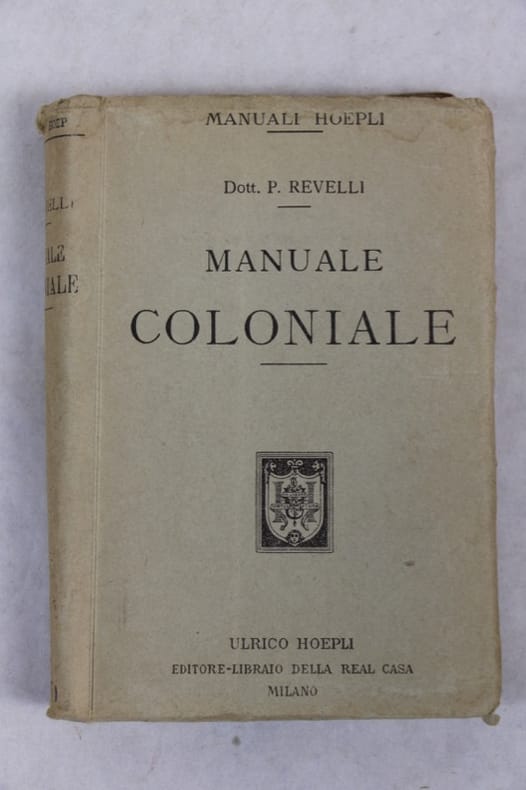 Pubblicato per iniziativa della Società di esplorazioni geografiche di Milano. Hoepli, Milano, 1914. In-24 gr., tela editoriale (leggerm. allentata), pp. XII,240 + 64 di catalogo manuali, con 1 tabella relativa al dominio coloniale, 1 carta della distribuzione geografica del dominio coloniale e 3 carte geografiche (Libia, Eritrea e Somalia italiana), tutte a colori e più volte ripieg. Prima edizione. Testo ben conservato.