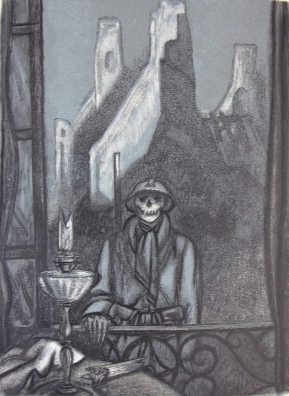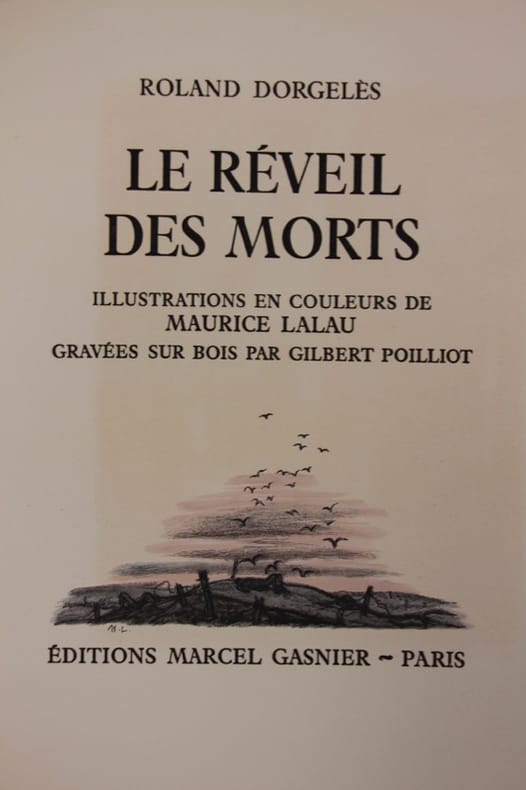 Bel exemplaire in-4 relié demi-maroquin rouge à coins (250x190mm), dos à caissons mosaïqué avec encadrements multiples et date dorée en queue, tranche de tête dorée, fin liseré doré sur les plats, 1fbnc, 1fcouv, 1fbnc,1f faux-titre, 1f frontispice pleine page de Pierre Falké, 1ftitre avec vignette gravée, 1fdédicace, 256pages,1fachevé d'imprimer, 1fbnc,1fcouv,1fbnc. Couvertures et dos conservés. Exemplaire numéroté 1030/1130 imprimé sur Vélin de Rives à la forme. Reliure signée Bonneau. Outre le frontispice et la vignette, Pierre Falké (1884-1947) a orné l'ouvrage de 11 eaux-fortes sous serpentes et de 40 bois. Pierre Falké sut allier le travail de coloriste au métier de graveur avec tant de dextérité qu'il en devint l'un des illustrateurs les plus réputés de sa génération. Il illustra talentueusement les oeuvres d'Edgar Poe, de Chadourne, de Jules Renard et de De Foe. Le réveil des morts s'avère un très beau témoignage de l'auteur sur un aspect assez peu connu : la reconstruction de la Picardie dévastée après la première guerre mondiale. Exemplaire en excellent état.