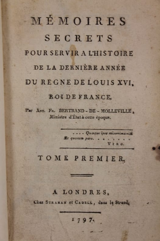 Une source particulièrement précise pour la vie politique de 1789 à 1792 (Fierro). Bertrand de Molleville (1744-1818) fut ministre de la Marine d'octobre 1791 à mars 1792. Bon état d’occasion