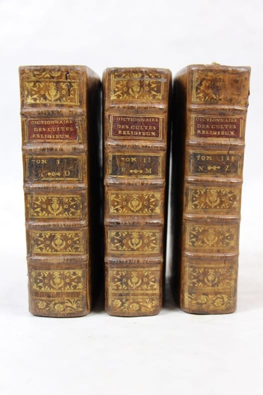 ouvrage dans lequel on trouvera les différentes manières d'adorer la divinité....., l'histoire abrégée des dieux & demi-dieux du paganisme......, leurs sectes & hérésies principales..... Paris, chez Vincent, Imprimeur-Libraire, 1770. 3 forts vol. pt in-8, reliure plein veau marbré de l'époque, dos à nerfs orné, doré, pièces de titre en maroquin rouge, pièce de tomoaison vert, tranches rouges. Orné de figures en taille-douce. (4 planches dépliantes finement gravées). Dos légèrement frottés. L'intérieur en très bon état.