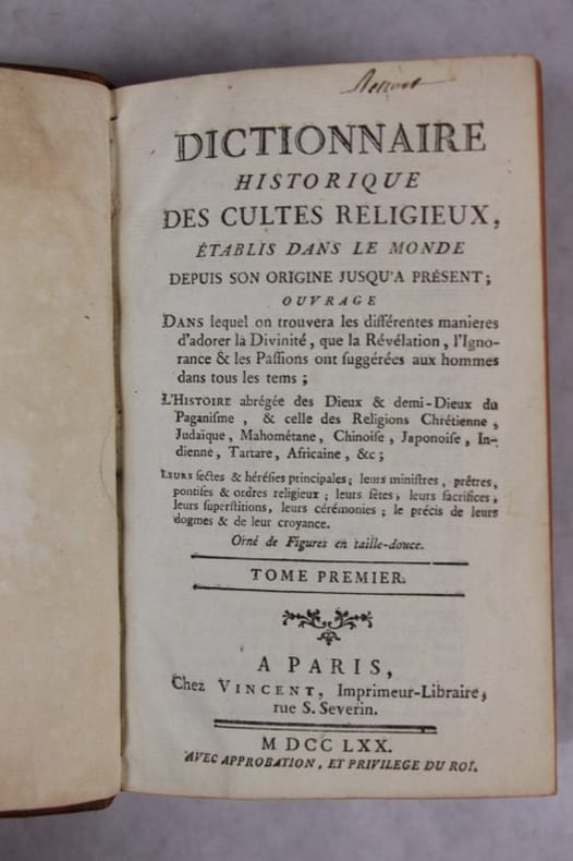 Paris , Vincent, Paris , Vincent1770 ; 3 volumes petit in-8, veau orné de l’époque. ÉDITION ORIGINALE de cet excellent ouvrage très complet. L’auteur était de Compiègne. - Cioranesco 35479 - Religions de l’Antiquité et des temps modernes du monde entier, sectes, hérésies, cérémonies, fêtes, ordres religieux, dogmes, etc. - 4 planches dépliantes gravées hors-texte (bonzes chinois, Dalaï-Lama, idolâtrie des nègres de Guinée, sacrifices humains au Mexique.)