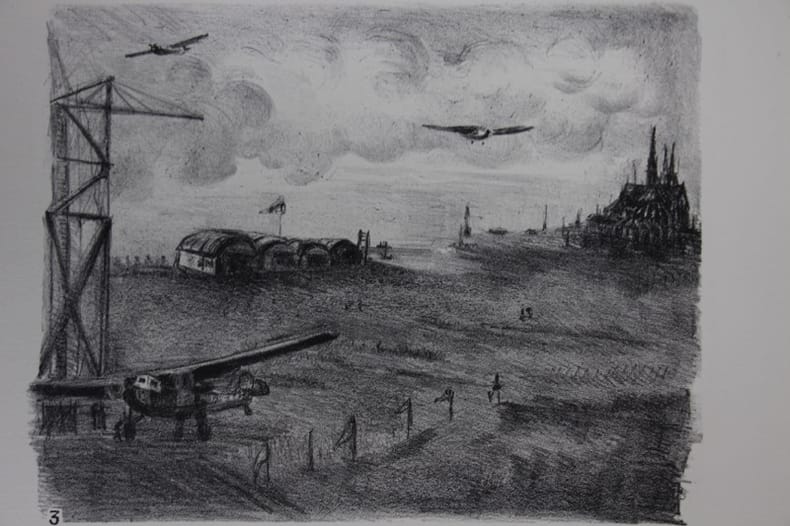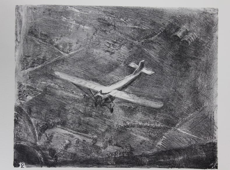 Paris, Tirage hors commerce au bénéfice des oeuvres de l’aviation française 1932 In-folio, portefeuille toilé à lacets et recouvrements dos usé. Titre, 3 ff. & 11 lithographies une double en camaïeu. Bel état intérieur.