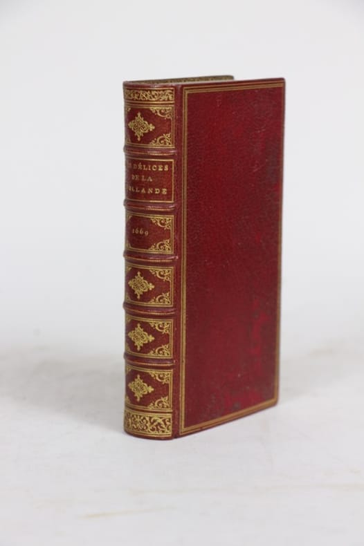 Amsterdam, Jean de Ravestein 1669 In-18, plein maroquin cerise, dos à nerfs, caissons ornés, roulettes et dentelles, triple filet sur les plats, double en coupe, dentelle en contreplats, tranches dorées Duru, titre gravé, 8- 489- 2 pp. Une carte, 12 plans repliés et 2 figures hors-texte, une double Amsterdam. Plat un peu fané, sinon très bon exemplaire.