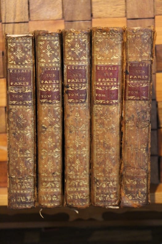 Chez la Veuve Duchesne, Libraire 1776 5 Tomes, in-12, reliure de l’époque plein veau marbré, dos lisse orné de motifs floraux, tranches jaspées, frontispice, 370 pp - 336 pp. - X + 374 pp. - 487 pp. - 239 + 139 pp. - 484 pp. Reliure usée. En l’état.