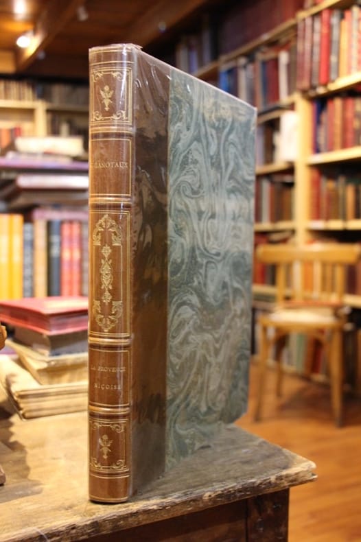 Nice, Librairie Cumin frères, coll. « La Renaissance Provençale » 1928 L’un 102 des 3 000 exemplaires sur vélin bouffant, in-4, reliure demi-maroquin , 1re et 2e, couvertures, dos d‘origine conservés dos à 4 nerfs ornés de filets dorés, caissons ornés de motifs romantiques dorés, auteur et titre dorés, plats jaspés verts, tête dorée, X + 159 pp. Dos insolé, coupes de pied légèrement frottées. Bel exemplaire.