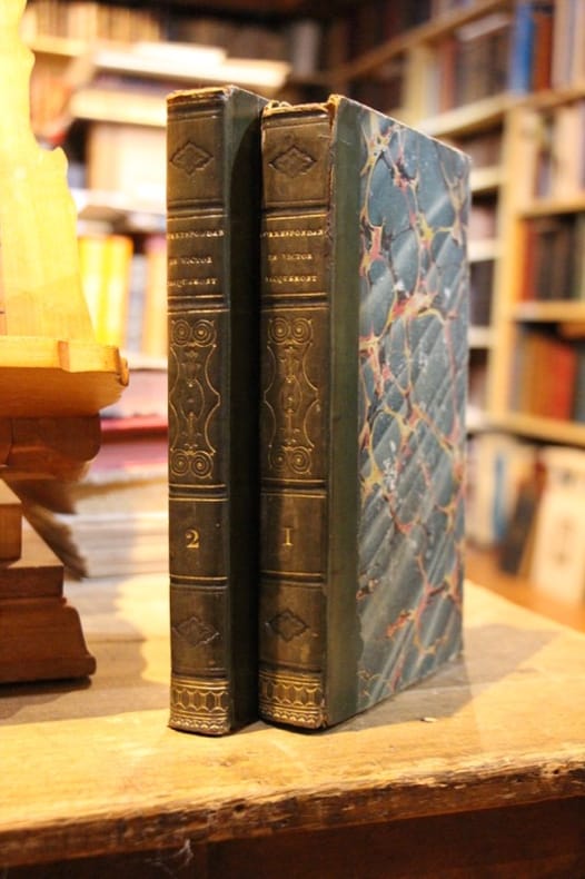 Librairie de H. Fournier 1835 2 tomes, in-8, reliure demi-basane verte, dos ornés de filets et dentelles romantiques dorés et de fleurons à froid, tranches jaspées, frontispice sous serpente portrait de Victor Jacquemont, 434 + 417 pp., carte dépliante in-fine. Coiffes et coins frottées, rousseurs éparses.