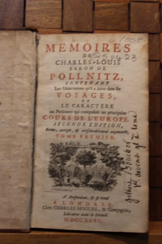 Charles-Louis, baron de Pöllnitz (1692-1775), semble avoir manifesté très jeune un tempérament impétueux et aventureux. Il était aussi dépourvu de scrupules, qualité qui lui servit dans les innombrables cours européennes qu'il visita et lorsqu'il servit sous les armes en Autriche, en Italie et en Espagne. ses "Mémoires" constituent une intéressante source d'informations sur sa vie et les peuples qu'il visita. Bon état d’occasion