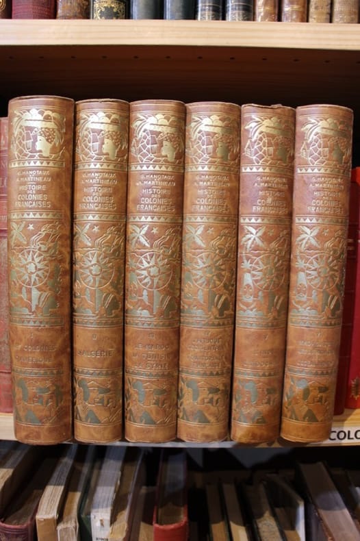 Société de l’Histoire nationale - Librairie Plon 1929 6 tomes. In-4 24 x 29 cm. Reliure demi-percaline imitation basane fauve flammée à coins, dos lisse orné, tranches rouges. 630 - 547 - 604 - 611 - 598 - 583 pp. Nombreuses illustrations en noir et cartes in-texte, ainsi que 8 planches d'illustrations hors-texte en couleurs par volume. Coiffes très légèrement émoussées et frottées, coins très légèrement frottées, intérieur légèrement jauni. Bel ensemble.Tome 1: Introduction générale et l’Amérique - tome 2 : l’Algérie - tome 3 : le Maroc, la Tunisie, la Syrie, l’oeuvre scientifique française en Syrie et en Perse - tome 4 : l’Afrique occidentale française, lAfrique équatoriale française, la Côte des Somalis; tome 5 - l’Inde, l’Indochine - tome 6 : Madagascar, les Comores, les îles de France et de Bourbon, le Pacifique français, les Français dans l’Afrique du Sud, conclusion générale.