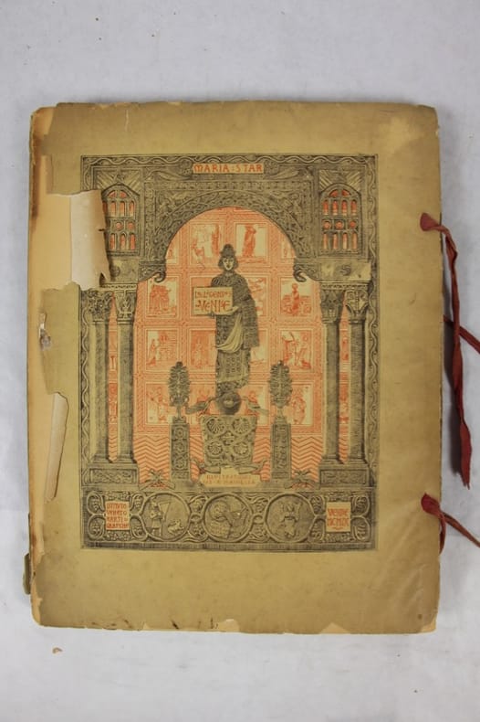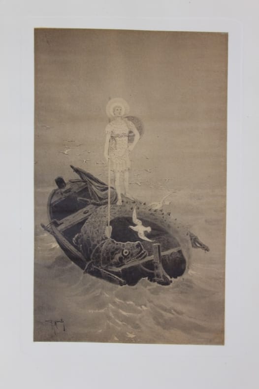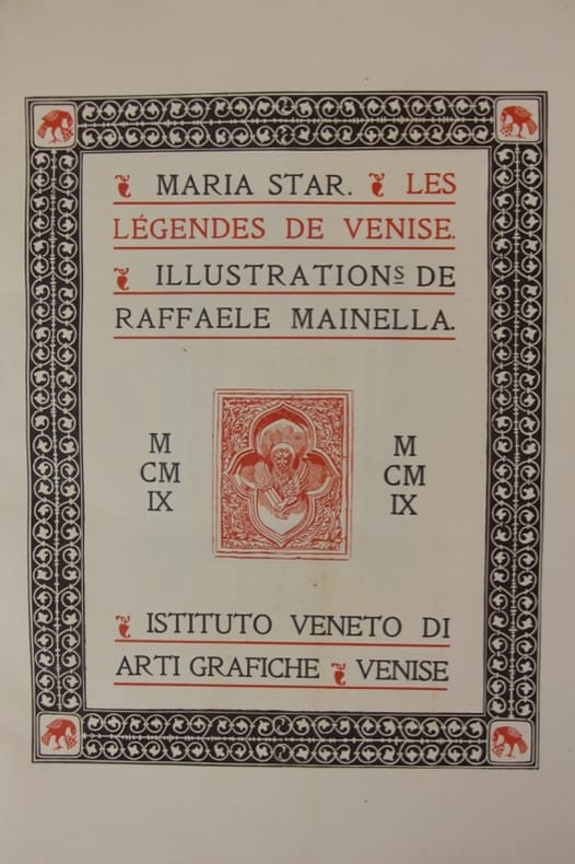 1909 Venise, Istituto Veneto di Arti Grafiche, 1909; grand in-4 broché, couverture illustrée d'une composition en noir et rouge au 1er plat; 128pp., chaque page inscrite dans un large et bel encadrement en bois en noir ou en couleurs, grandes lettrines et culs-de-lampe tirés en rouge. Frontispice en 2 tons (même illustration que la couverture), illustrations dans le texte ( bandeaux) et hors texte en 2 tons ou en camaieu souvent d'inspiration symboliste. Les illustrations hors texte tirées sur papier très fin sont contrecollées et protégées de serpentes ornées d'un encadrement typographique. Ouvrage tiré à petit nombre, celui-ci portant le N° 101.