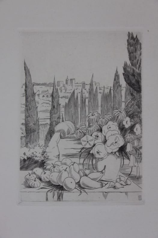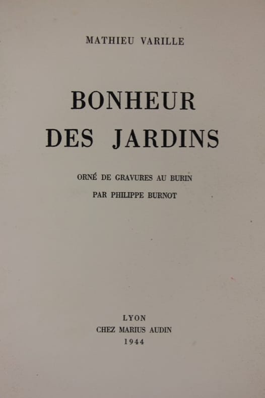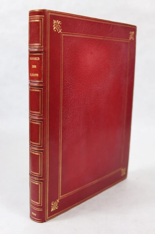 Lyon, chez Marius Audin 1944 In-4 plein maroquin cerise, dos à nerfs, caissons dorés, filets bruns et dorés, filets dorés d’encadrement des plats, fleurons d’angles, double filet sur les coupes, larges dentelle int., garde de cuir, 131 pp. Frontispice & 10 compositions hors-texte : jardin potager, bouquetier, alpin, anglais, arabe, etc. Superbe exemplaire.