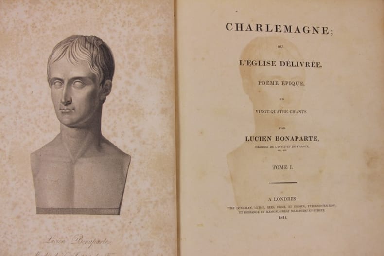 Édition publiée en même temps que l'originale de Londres, de la plus grande rareté et tirée à petit nombre.Mis au ban de la famille impériale, défenseur de Rome et des États pontificaux en 1808, Lucien tentera en août 1810 un départ pour les États-Unis. Arrêté par un bateau anglais, il est fait prisonnier à Malte puis placé en résidence surveillée au château de Thorngrove en Angleterre. C'est là qu'il rédige son Charlemagne, poème épique peu salué par la critique et qui ne fut pas à proprement parler un succès de librairie. Didot, l'éditeur français qui se chargea d'une nouvelle édition en 1815, avouera même à Lucien durant les Cent-Jours que les trois quarts des exemplaires imprimés sont restés dans son magasin (cité par F. Piétri, Lucien Bonaparte, pp. 275-278). Il revint à Rome en 1814.Dédié au pape avec emphase, cette ode a pour thème l'inspirateur même du régime napoléonien. On sait en effet a quel point Napoléon s'inspira de Charlemagne pour fonder son règne, notamment au moment du sacre.Agréable exemplaire "dans son jus".Cette édition n'est mentionnée par aucune bibliographie, qu'elle soit générale (Quérard) ou spécialisée (Davois). - - VENTE PAR CORRESPONDANCE UNIQUEMENT - LIEN DE PAIEMENT, NOUS CONSULTER.