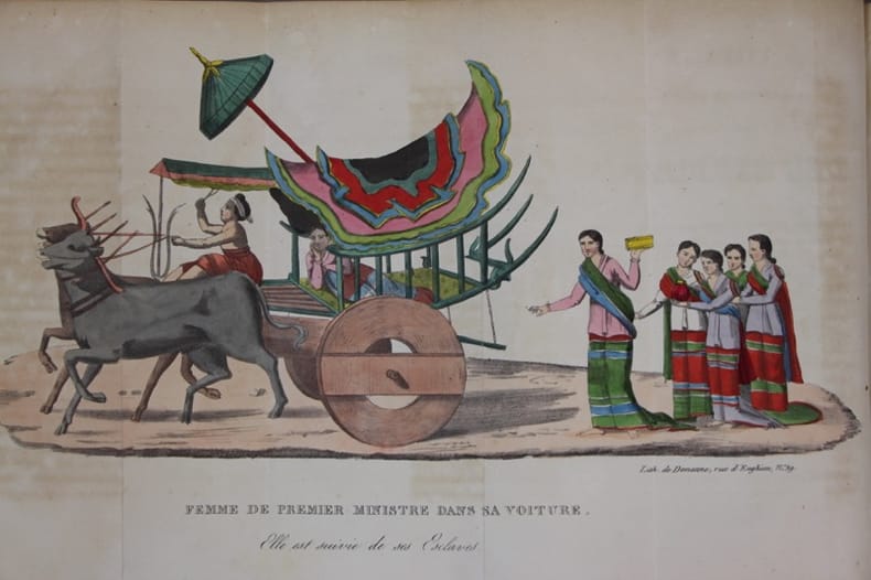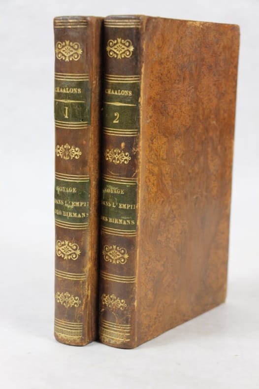 Arthus Bertrand 1825 2 volumes petits in-8, plein veau marbré, dos lisse, filets et fers dorés, pièces de titre et de tomaison vertes, XI- CLVI- 210- 402 pp. Carte de l'empire birman, dressée et dessinée par Desmadryl jeune petite déch. sans manque, et 5 lithographies coloriées à la main par Demanne, une repliée, représentant des personnages en costume. Rares rousseurs. Coins très lég. émoussés. Très bon exemplaire.