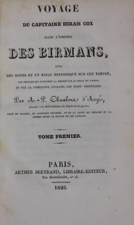 Première édition française de ce témoignage précieux sur la Birmanie. Dépêché en 1795 par la Compagnie anglaise des Indes orientales auprès de la cour impériale pour des négociations commerciales, le capitaine Hiram Cox, fut aussi chargé d’intervenir dans la province d'Arakan, alors tyrannisée par le gouvernement birman. Il trouva la mort au cours de cette mission en 1798. Son journal fut publié en 1821 à Londres, il est ici enrichi d'un grand nombre de notes et d'un essai historique sur l'empire des Birmans, par Chaalons d'Argé (1798-1869). Bon état d’occasion
