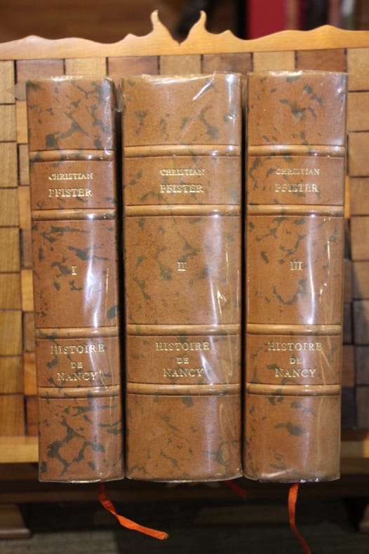 Paris, Berger-Levrault & Cie Libraires-Éditeurs, 1902 ; grand in-8 jésus, XXIV-752 pp. + 30 pl. hors-texte, VIII-1104 pp. + 45 pl. hors-texte, VIII-916 pp. + 27 pl. hors-texte, reliure d'éditeur demi-maroquin rouge, dos lisse estampé en fers spéciaux dorés représentants le chardon lorrain, la croix de Lorraine et les alérions, tête dorée. Les 3 volumes. L'auteur était correspondant de l'Institut, ainsi que recteur de l'université de Strasbourg. Tome I. – Depuis les origines jusqu'à la mort du duc René II (1508). Tome II. – De l'avènement du duc Antoine à la mort d'Henri II (1624). Tome III. – De l'avènement de Charles IV à la mort de Stanislas à la réunion de la Lorraine à la France (1766). La meilleure histoire de Nancy. Histoire fouillée et presque indépassable.Il ne faut rajouter que l'histoire contemporaine des 100 dernières années et nous avons toute l'histoire de la ville de Nancy. Nombreuses illustrations en noir et blanc et quelques-unes en couleurs, in texte et hors-texte. Bon état.