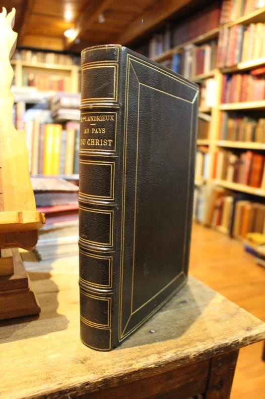 in 4 reliure éditeur demi-cuir marron à nerfs, fers, titre dorés, couverture en couleurs conservée, faux-titre, titre, grande carte dépliante de la Palestine, XV, 658 pages sur papier couché, Nombreuses illustrations dans le texte et à pleine page, un plan de Jérusalem, dépliant par l’abbé Henri NICOLE. Non rogné, tête dorée, étui cartonné. Maison de la Bonne Presse, sans date. Très bon état, proche de l’état de neuf,