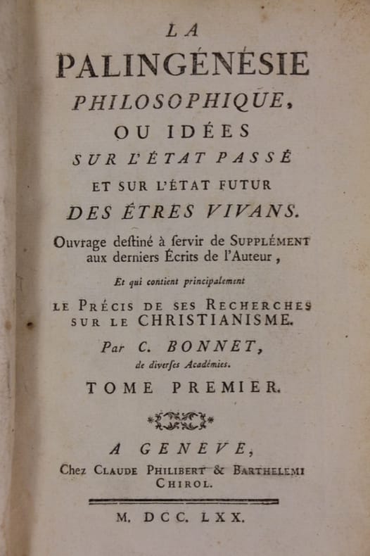 ---- BEL EXEMPLAIRE ---- "BONNET is considered one of the FATHERS OF MODERN BIOLOGY. He is distinguished for both his experimental research and his philosophy, which exerted a profund influence upon the naturalists of the eighteenth and nineteenth centuries... A true theoretician of biology, he xercised an enormous infuence in this field and maintaine a correspondence with almost all the scientists of his time. He published works that caused a cnsiderable stir... Bonnet was an enthusiastic champion of preformation. This theory which Bonnet christened "palingenesis" set forth the functional structural notion of the cell, which was not stated formally until a hundred years later". (DSB II pp. 286/287)**A1