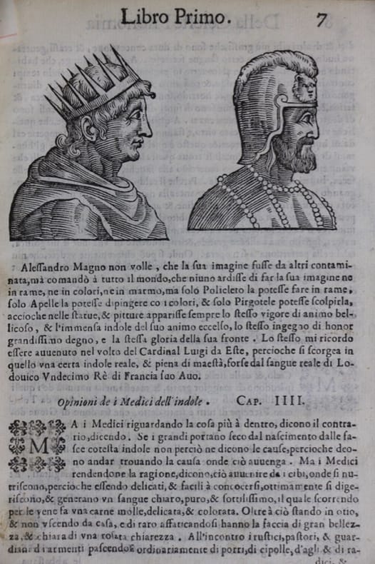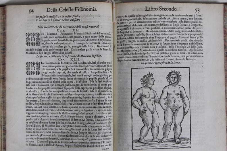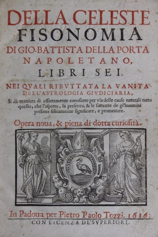 Première édition en italien (première édition latine en 1586) de cet ouvrage singulier. Elle renferme 35 figures sur bois dans le texte, certains répétés, juxtaposant souvent visages humains et têtes d’animaux, signes du zodiaque ou portraits historiques. En pièces liminaires : Epitre dédicatoire de P. P. Tozzi à Bernardino Guidoni, abbé de S. Danièle in Monte, à Padoue. - Index. - Poème de Giulio Cesare Cortese. - Portrait gravé sur bois de Giovan Battista Della Porta. Bon état d’occasion