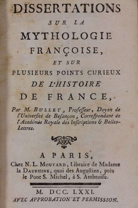 Edition originale. L'auteur avait déjà fait paraître une série de "Dissertations sur différens sujets de l'histoire de France", à Besançon en 1759. Jean Baptiste Bullet est un théologien originaire de Besançon, où il fit toute sa carrière, terminant doyen de la Faculté de la ville. Outre plusieurs publications d'histoire religieuse et de théologie, il est encore un peu connu pour un essai sur la langue celtique, des recherches historiques sur les cartes à jouer, et pour ces curieuses dissertations dont les sujets sont assez variés : "Sur Mélusine - Sur la Reine Pédauque, Sur le chien de Montargis - Où l'on prouve que Romme a été prise deux fois par les Gaulois ; que Hugues Capet est monté sur le trône par une élection légitime - Sur le titre de Très-Chrétien que porte les rois de France - Sur le titre de Dauphin que porte le fils-aîné de nos rois - Sur l'institution des Pairs de France - Sur l'état des évêque sous la première race de nos rois - Sur l'origine des carrosses". L'auteur cite largement ses sources et n'hésite pas à reproduire les textes latins dont il se sert ou qu'il critique ; en grand amateur d'étymologie il a régulièrement recourt à cette science pour expliquer l'origine la fable de Mélusine, l'identité de la Reine Pédauque, ou encore la raison de la fleur de lys comme emblème des rois de France...