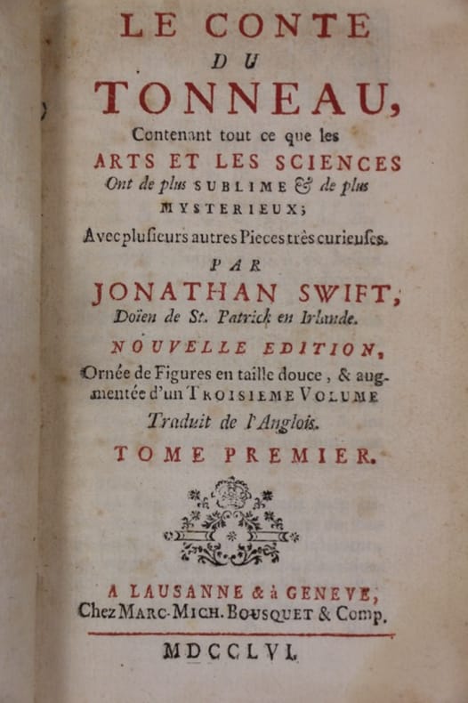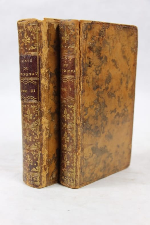 - 1764. Trois volumes in-12 (171 x 102 mm), titre - (8) ff. - 314 pp. (mal chiffrées 312), titre - (6) ff. - 296 pp., XX pp. (faux-titre et titre inclus) - 280 pp., basane marbrée, dos lisse orné, dentelle sur les coupes, tranches rouges (reliure d'époque). Orné de 8 gravures par Reinhardt fils, dont un frontispice. Le 3e volume, "Traité des dissentions entre les nobles et le peuple, dans les Républiques d'Athènes & de Rome, &c. L'Art de ramper en poésie ; et l'Art du mensonge en politique", est édité par Marc Chapuis en 1764. (reliure usée, dos frottés, quelques manques aux coiffes, coins émoussés, trou de ver tome 1 au bas des 30 premières pages, quelques rousseurs). (Brunet, Quérard). // Three 12o volumes (171 x 102 mm), title - (8) ff. - 314 pp. (numbered 312 by mistake), title - (6) ff. - 296 pp., XX pp. (including half-title and title) - 280 pp., marbled roan, smooth spine tooled, dentelle on turns-in, red edges (contemporary binding). Illustrated with 8 engravings by Reinhardt fils, including frontispiece. The third volume, "Traité des dissentions entre les nobles et le peuple, dans les Républiques d'Athènes & de Rome, &c. L'Art de ramper en poésie ; et l'Art du mensonge en politique", is published by Marc Chapuis in 1764. (used binding, spine rubbed, some lack of leather on top and bottom of spine, corners used, worm-hole on bottom of 30 first pages vol. 1, some spots). (Brunet, Quérard).