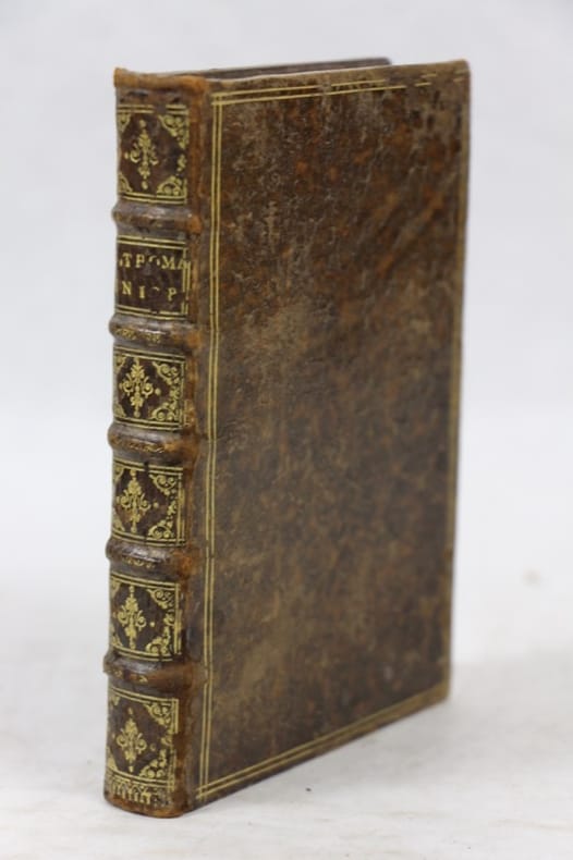 Parisiis, Claudium Fremy 1557 In-12, plein veau marbré, dos à nerfs, caissons ornés, double filet d’encadrement des plat, guirlande en coupe rel. XVIII, titre gravé, 6- 200 ff. Rel. lég. desquamée. Int. très frais. Ex-libris manus. au titre.