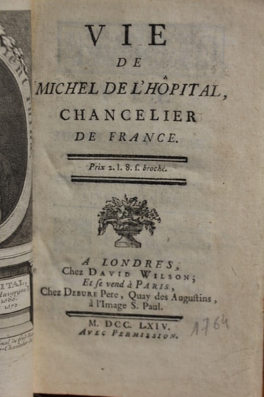 Londres Paris, David Wilson, Debure Père 1764 In-16 10 x 16 cm. Reliure de l’époque pleine basane fauve, dos lisse orné de fers dorés, pièce de titre maroquin rouge, 469 pp., frontispice. Coiffes et coins légèrement frottés et émoussés. Exemplaire en bon état. Biographie de Michel de l'Hôpital qui fut l'un des serviteurs les plus dévoués à l'établissement d'un état centralisé et puissant. Les ordonnances qu'il rédigea, portaient en germe les deux grands principes du droit public, la liberté et l'égalité, et furent considérées par de nombreux observateurs comme l'ébauche des grandes réformes de la révolution française.
