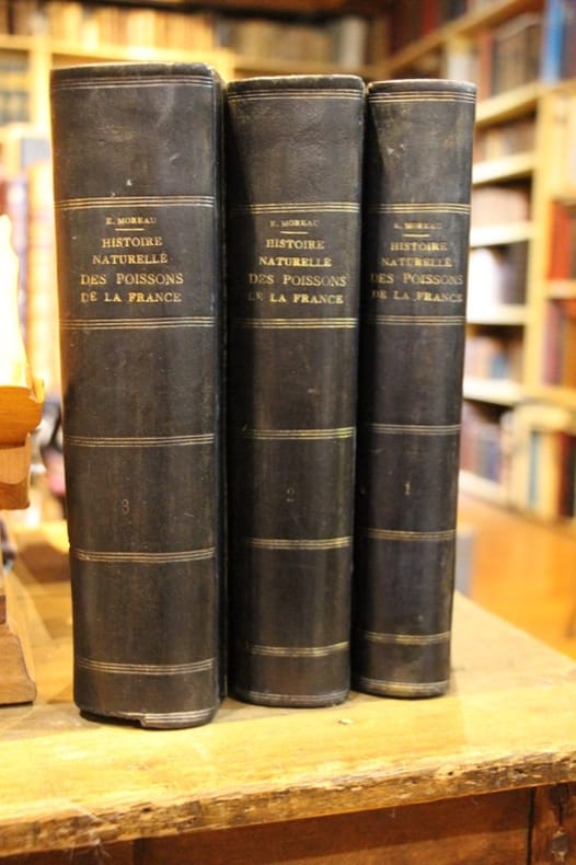 G. Masson 1881 3 tomes. Fort in-8 16 x 24 cm. Reliures de l’éditeur demi-basane noire, dos lisses, filets, auteur, titre, et tomaison dorés, VII + 478 - 572 - 697 pp., 220 figures dans le texte dessinées d’après nature. Têtes, coinsn, coupes et plats frottés, intérieur en bon état. Supplément in fine du tome III, bibliographie, table générale des noms de poissons.