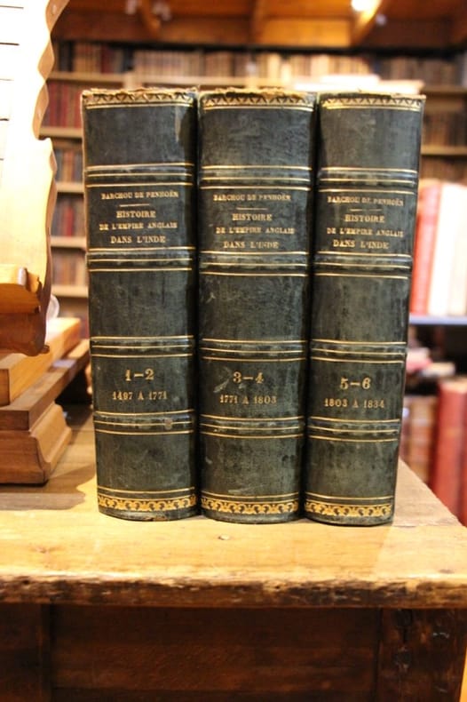Jules Renouard 1841 6 tomes en 3 volumes. In-8 14 x 21,5 cm. Reliures demi-basane vert foncé, dos à 4 nerfs plats ornés de filets dorés, de roulette dorée en tête et en pied, auteur, titre et tomaison dorés. LII + 1 carte dépliante + 490 - 506 ; 507 - 534 ; 471 - 486 pp. éraflures mineures et éparses sur les dos et les coiffes, sinon bel ensemble d’un ouvrage rare. Volume I : 1497 à 1771 - Volume II : 1771 à 1803 - Volume IV : 1803 à 1834. L’oeuvre majeure de Barchou de Penhoën 1801-1855 mérite d’être redécouverte pour son intérêt pour l’empire colonial édifié en Inde par les Britanniques, entreprise qui n’a guère suscité l’intérêt des érudits et historiens français.