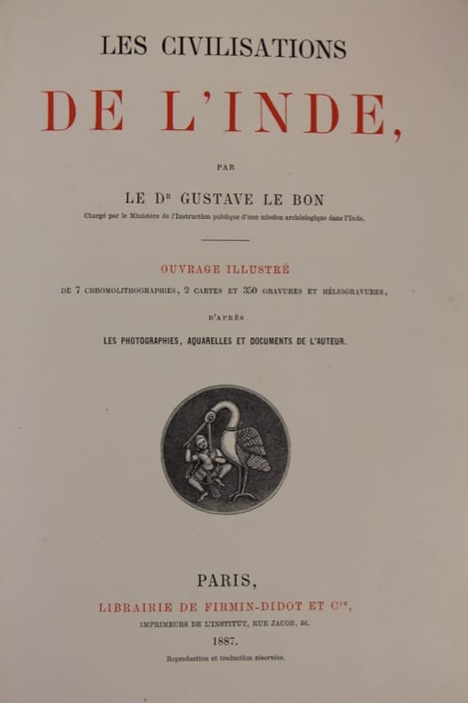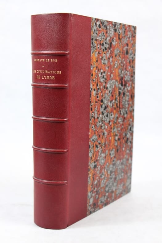 Paris, Flammarion, 1900. Seconde édition revue et enrichie par l'auteur. In-quarto, 29 x 21 cm, 755 pp. Illustré de 352 héliogravures. Livre replacé dans une reliure contemporaine bleue, plats muets, dos avec titre et nom d'auteur en doré. Tranches dorées. Bandeaux et lettrines. Livre dédié à Sadi-Carnot, président de la République (1887-1894) et patron de la mission dont Le Bon a tiré le contenu de l'ouvrage. Aujourd'hui surtout connu pour sa Psychologie des foules (1895), Gustave Le Bon s'est intéressé au domaine émergent de l'anthropologie dans les années 1870 et a voyagé à travers l'Europe, l'Asie et l'Afrique du Nord. Influencé par Charles Darwin, Herbert Spencer et Ernst Haeckel, Le Bon a soutenu le déterminisme biologique et comparé les groupes ethniques et les sexes ; après de longues recherches sur le terrain, il postule une corrélation entre la capacité crânienne et l'intelligence dans "Recherches anatomiques et mathématiques sur les variations de volume du cerveau et sur leurs relations avec l'intelligence" (1879), qui lui vaut le prix Godard de l'Académie des sciences. Au cours de ses recherches, il inventa un céphalomètre portable pour mesurer plus facilement les caractéristiques physiques des peuples éloignés et, en 1881, publia un article, "Le céphalomètre de poche ou boussole de coordonnées", décrivant dans le détail son invention et son application. En 1884, il est chargé par le gouvernement français de parcourir l'Asie et de rendre compte des civilisations qui s'y trouvent. Ses voyages ont débouché sur de multiples livres et l'ont aidé à développer sa pensée, en percevant la culture comme principalement influencée par des facteurs héréditaires tels que les caractéristiques raciales uniques du peuple. Le premier livre, La Civilisation des Arabes, est sorti la même année en 1884. Dans celui-ci, Le Bon fait l'éloge des Arabes pour leurs contributions à la civilisation, mais critique l'islam comme un facteur de stagnation. Il a également décrit la culture des Arabes comme supérieure à celle des Turcs qui les gouvernaient, et les traductions de cet ouvrage ont inspiré les premiers nationalistes arabes. Il enchaîne avec un voyage au Népal, devenant le premier Français à visiter le pays, et publie Voyage au Népal en 1886, puis Les Civilisations de l'Inde (1887), dans lequel il applaudit l'architecture, l'art et la religion indiens tout en faisant remarquer que le progrès scientifique indien était resté pré-moderne, ce qui avait facilité la domination britannique. C'est ce livre qui sera enrichi et réédité en 1900. En 1889, il publie Les Premières Civilisations de l'Orient, qui donne un aperçu des civilisations mésopotamienne, indienne, chinoise et égyptienne. La même année, il a prononcé un discours devant le Congrès colonial international pour critiquer les politiques coloniales qui comprenaient des tentatives d'assimilation culturelle, et a déclaré, dans la lignée d'un Lyautey: "Laissez aux indigènes leurs coutumes, leurs institutions et leurs lois". Enfin, Le Bon a publié en 1893 son dernier livre directement tiré de ses voyages, Les monuments de l'Inde, où il loue de nouveau les réalisations architecturales des peuples indiens.