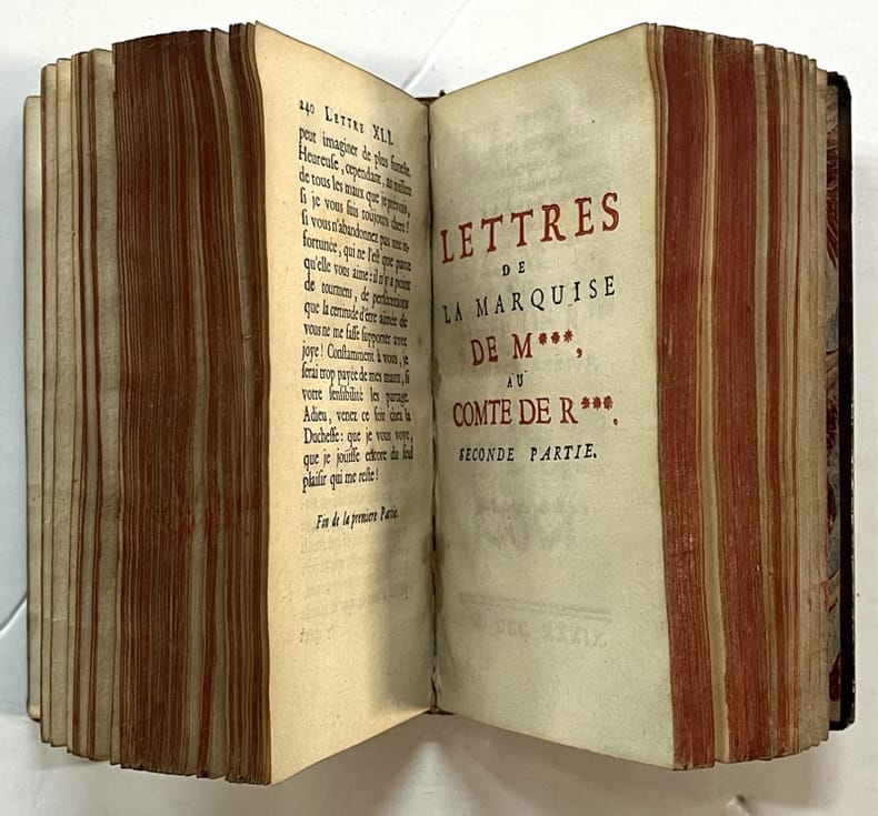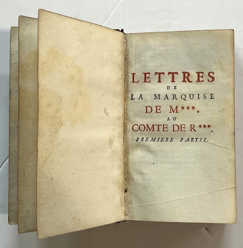 Seconde édition et première hollandaise. Pages de titre en rouge et noir. Une vignette de titre répétée. Reliure en plein veau d'époque tacheté. Dos à nerfs richement orné. Un petit manque en tête. 2 coins émoussés. Fente au mors supérieur en tête. Bon exemplaire.Célèbre roman épistolaire et libertin d'une passion tragique et qui s'achève par la mort de l'amante. C'est ici le jour d'un amour total et dévorateur, dont on ne sait s'il s'adresse à un homme réel ou à un idéal. Crébillon a choisi de ne nous donner qure les lettres de la Marquise qui s'emploie dramatiquement à analyser le moindre de ses sentiments, dont la passion d'amour la conduira à la mort, réalisant ainsi la lettre que porte son nom : M. - Photographies et détails sur www.Edition-Originale.com -