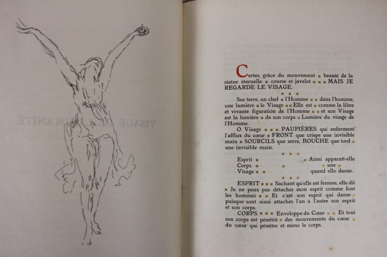 Edition origianle de cet élégant ouvrage au tirage limité à cent exemplaires num. sur Japon ancien imprimés par Frazier-Soye. Bourdelle fit la connaissance d’Isadora Duncan en 1903, lors d’un banquet donné à Vélizy en l’honneur de Rodin. C’est toutefois à partir de son interprétation d’Iphigénie en Tauride de Gluck, au Théâtre de la Gaîté-Lyrique en 1909 qu’il la découvre. Isadora Duncan devient dès lors l’incarnation même de la danse et l’inspiratrice de la plupart des œuvres qu’il dédia à cet art. Bon état d’occasion
