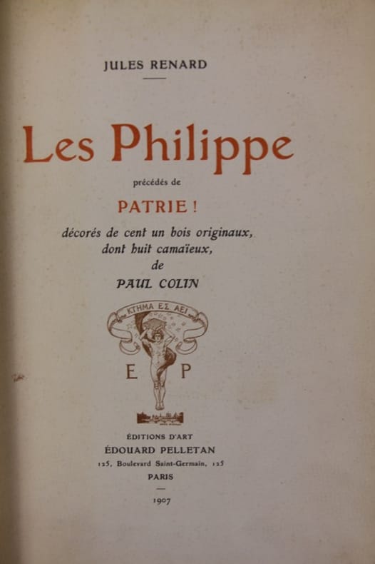 Paris Edouard Pelletan 1907 un volume petit in-4°, 135 (2) pp. Reliure en demi-basane brun, dos à nerfs orné, dos et couvertures conservés (reliure moderne). (dos insolé, légèrement frotté et légèrement tâché). Ouvrage illustré de 101 bois de Paul Colin. Un des mille exemplaires sur chiffon du Marais numérotés (n° 642). Complet du spécimen (8 pp.). Intérieur frais.